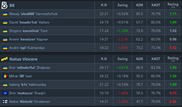 NAVI powered ahead to an 8-2 lead, suffocating B8’s attempts to gain map control. Although B8 managed to take the final two rounds of the half, NAVI immediately shut the door in the second pistol. Aleksi “Aleksib” Virolainen delivered a momentum-crushing triple kill in the post-plant, teeing up a clean 5–0 finish to close the map comfortably.