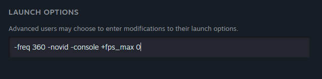 - Steam Launch Options: Right-click CS2 → Properties → Launch Options → add -freq 360 -novid -console +fps_max 0.